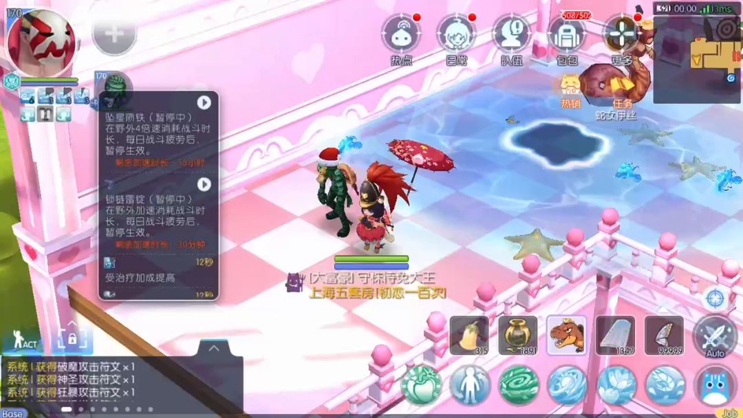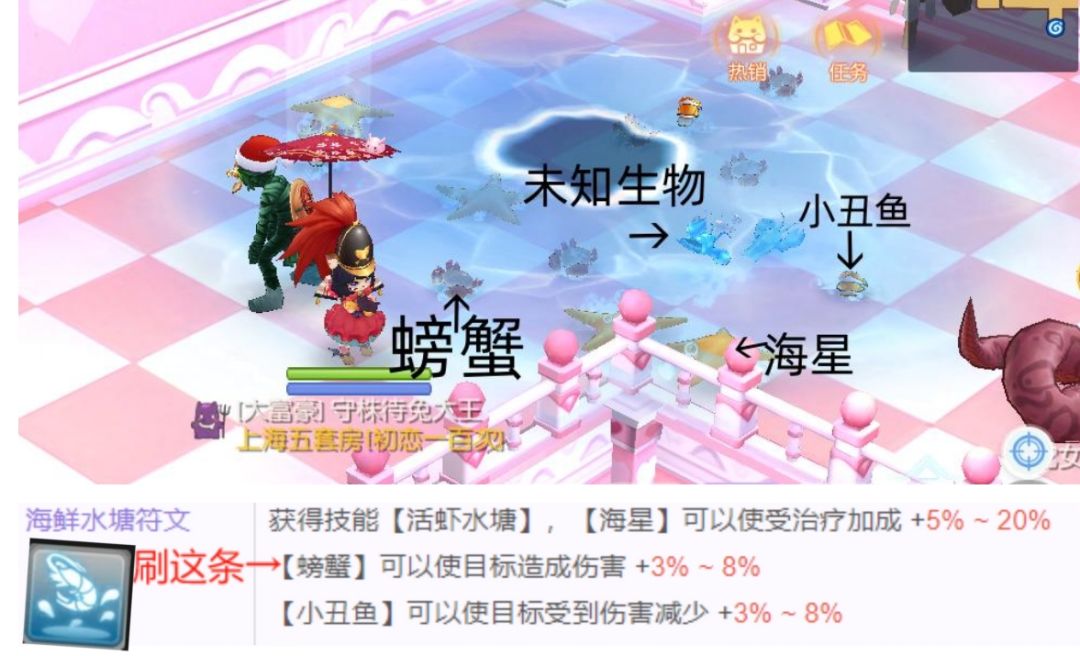 水塘可别小看他只有8%,因为可以叠3层,那就多了.但是想用好这个技能又很吃力,因为水塘的机制是先在地上出现水塘,再每隔几秒随机位置生产海星/螃蟹/小丑鱼若干个(条),需要玩家走过去吃(碰到或者踩到)/远程点击也行.首先你得认得他们0,0,并不是一次刷很多个,位置还不固定,效果也不共享(获取速度不够快和稳定),单个效果独自计算时间15秒,都可叠3层并各自刷新剩余时间
