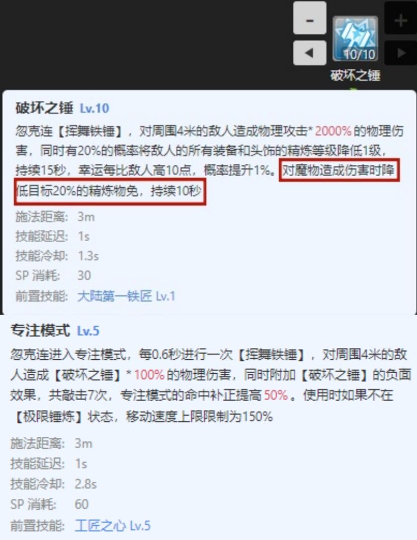 基础技能:破坏之锤 频率是1.3秒敲一次,提供的精炼物免持续10秒