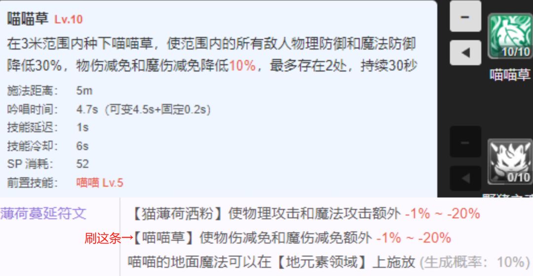 喵喵草非常容易使用,可以提前往地上一丢就完事了,效果又是群体的,持续时间长(30秒),距离也够用(5+2.5米)注:可同时存在2个,但效果并不叠加,喵草可放进自动栏,现在会在目标脚下释放而不是自身脚下![[表情_斜眼笑]](https://img.tapimg.com/market/images/d1b1dcc88719f6c9a639728cde152c4b.png)