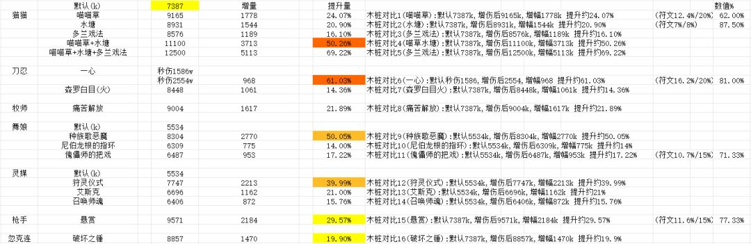 木桩对比1(喵喵草):默认7381k,增伤后9165k,增幅1778k 提升约24.07%(符文12.4%/20%)