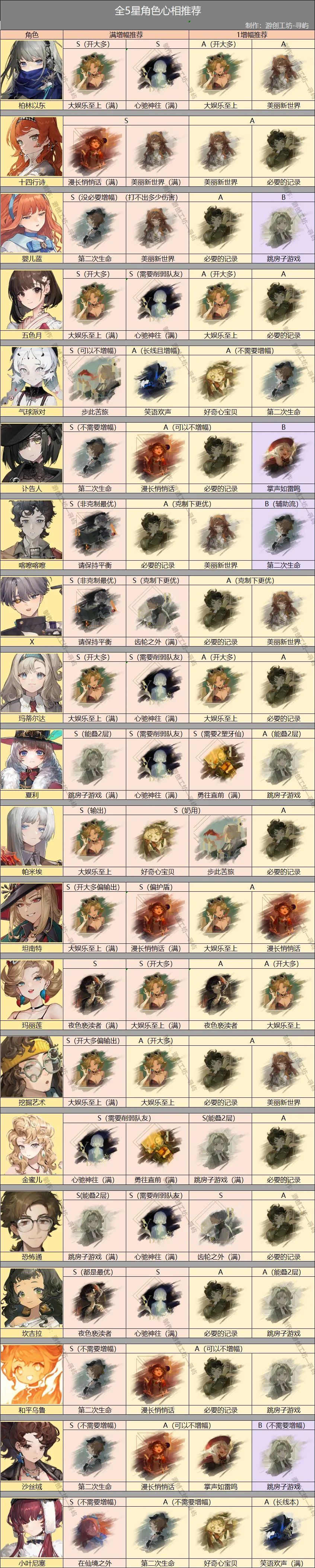 司辰们好呀,今天带来了1.7版本全5星角色心相推荐,新增5星心相齿轮之外,同时还加入满增幅与1增幅情况下的心相推荐。