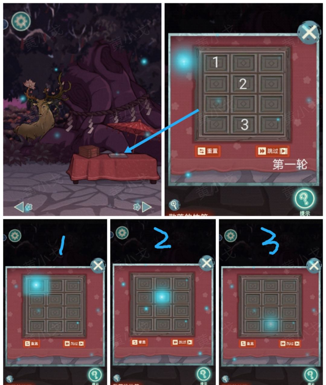 1.(缚灵木-树脚)点击桌子上的银色盒子,完成小游戏(根据萤火虫点亮按钮的顺序点击按钮,共四轮)