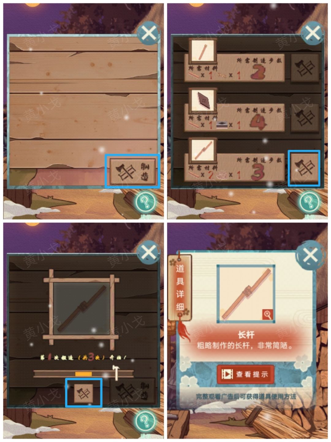 20.(农居-侧)先在堆积处拿两个木块;点击锻造台,点击制作(需要材料:2个木块、一条绳子),完成小游戏(3次),获得【长杆】