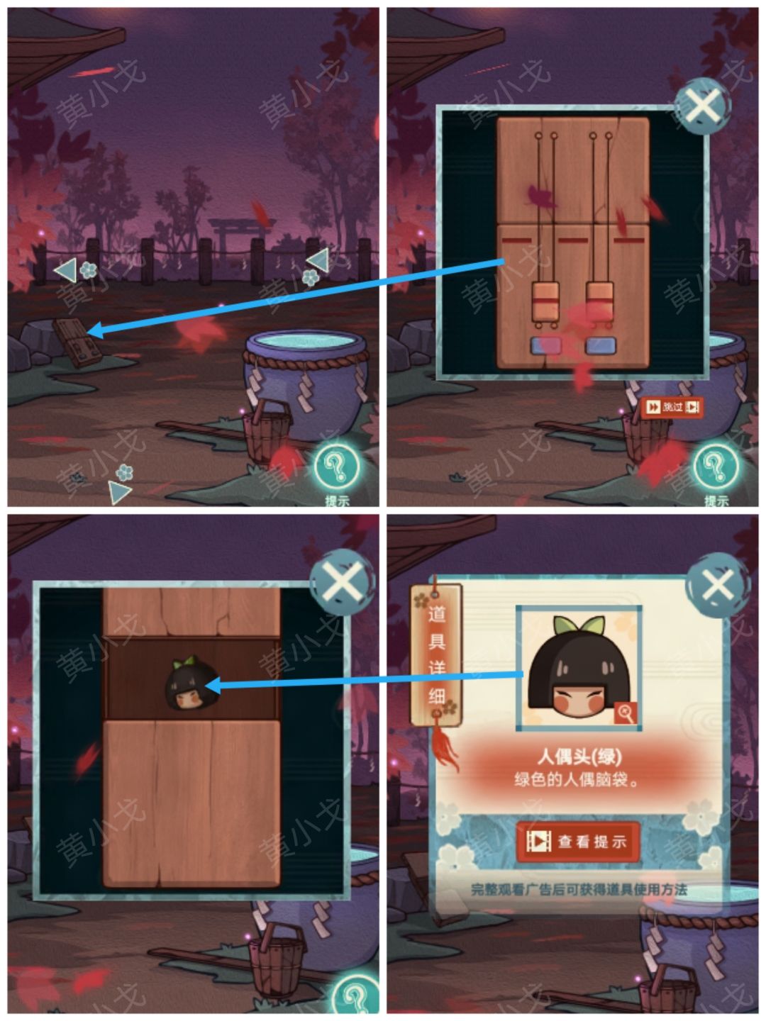 11.点击木板机关,完成小游戏(点击左中右三个按钮,使红线同时在一条线上);打开夹层,获得【人偶头(红)】