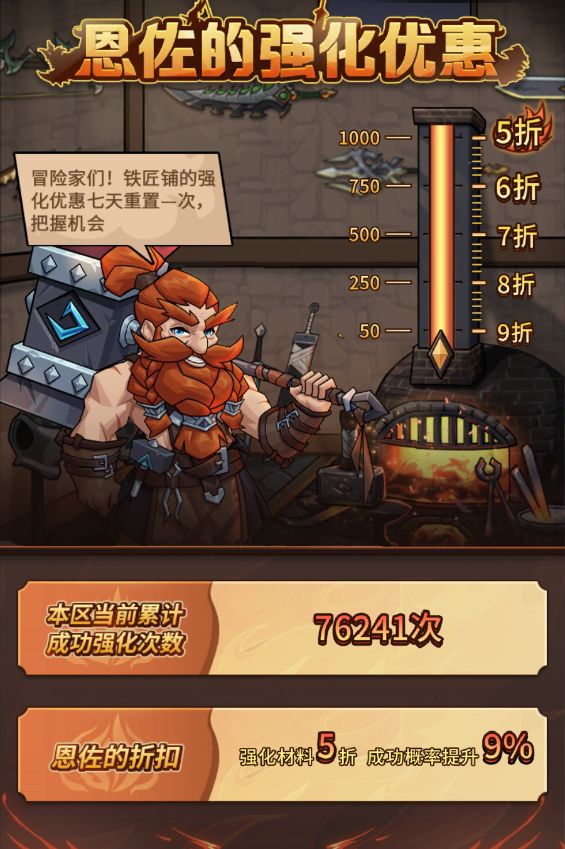 活动期间,统计各个区服成功强化装备次数,达到一定阶段即可获得强化材料折扣优惠和强化成功概率提升,更有强化材料火星石和金币回馈