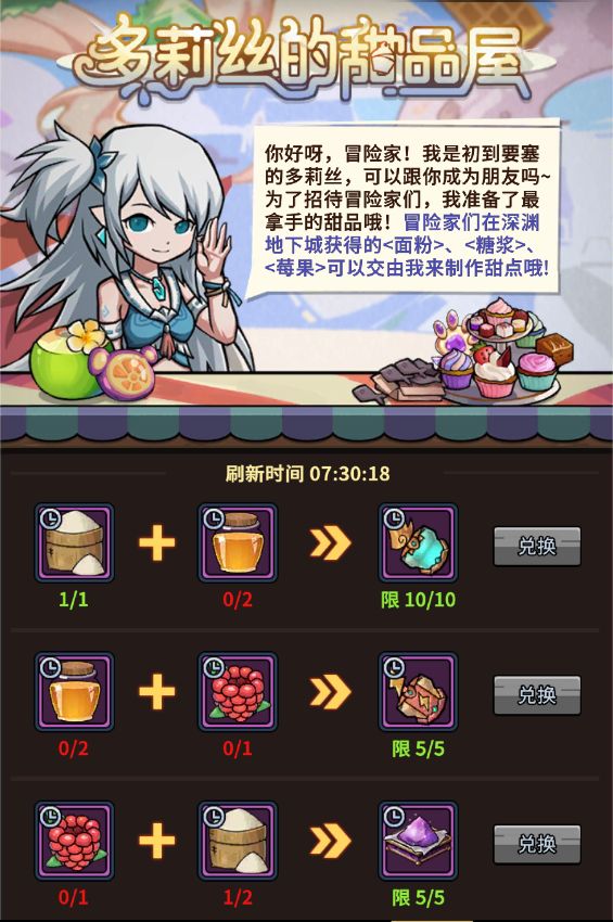 活动期间,玩家在深渊地下城内击败怪物有概率掉落面粉、糖浆和莓果,将不同的材料交给多莉丝可获得不同增益甜品,为了保证甜品的口感,请注意及时使用!