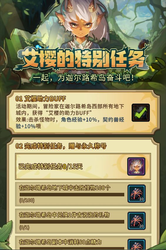 活动期间,登录即可领取艾樱的助力BUFF,在迦尔路希岛西部所有地下城内,击杀怪物时,额外获得角色经验、契约兽经验。在迦尔路希岛内累计完成特别任务15天,将赠与永久称号。