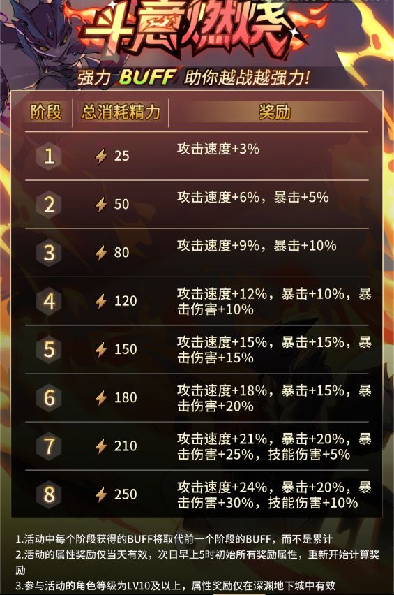 活动的属性奖励仅当天有效,次日早上5时初始所有奖励属性,重新开始计算奖励,属性奖励仅在深渊地下城中有效