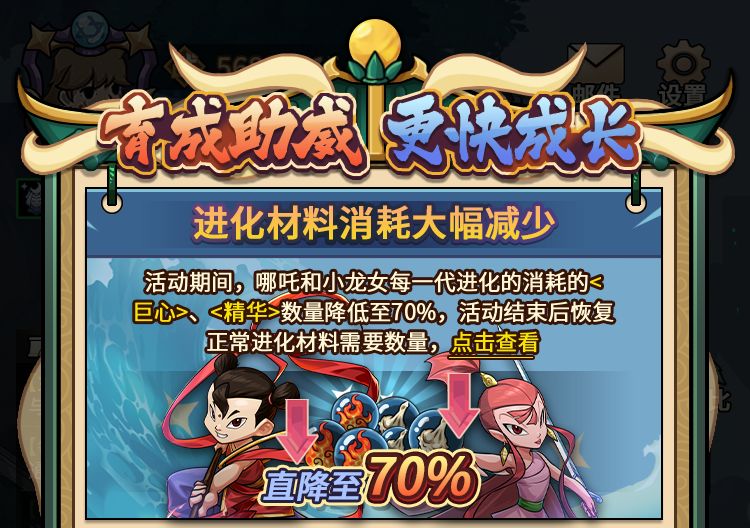 ●活动期间,哪吒和小龙女进化所消耗的巨心和精华数量降低至70%。小龙女高阶进化通行证开启,将小龙女进化到指定代数可获得火腿食品、小龙女进化包、玲珑宝珠奖励