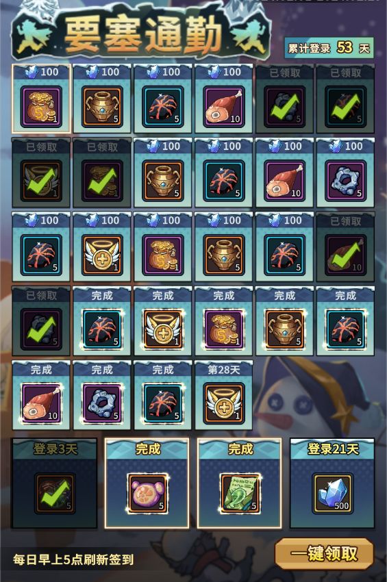 本月每天签到,可领取金币、黄金魔法罐、火星石、火腿食品、打孔石、复活币等奖品,未登录的奖品可使用钻石进行补签。累计登录指定天数还可领取随机巨心、迷幻软糖、卡戎号邀请函、钻石等额外奖品