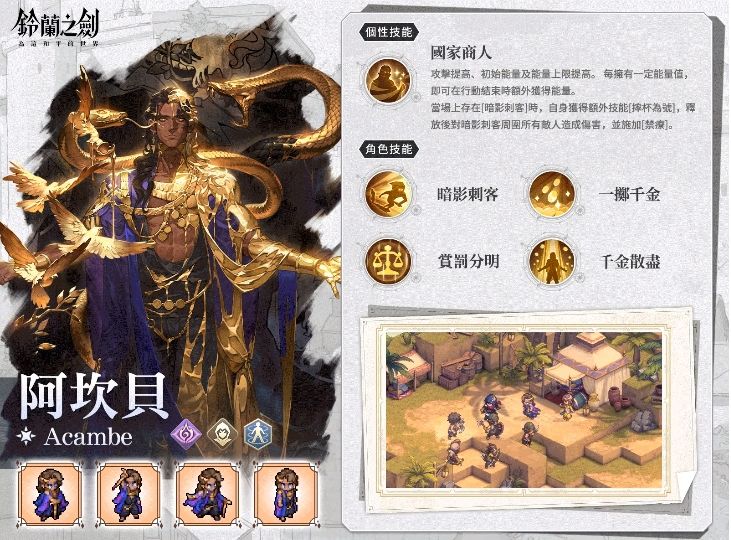 昨晚,台服正式公布了国家商人阿坎贝的相关技能。相比之前在剧情中登场的阿坎贝,传言的列阵如林大光环也保真。