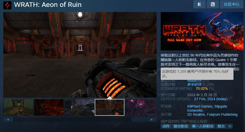 由KillPixel Games与Slipgate Ironworks共同开发、3D Realms和Fulqrum Publishing负责的第一人称复古射击游戏《怒火:永恒遗迹(WRATH: Aeon of Ruin)》,现已结束抢先体验,并在Steam平台正式推出。