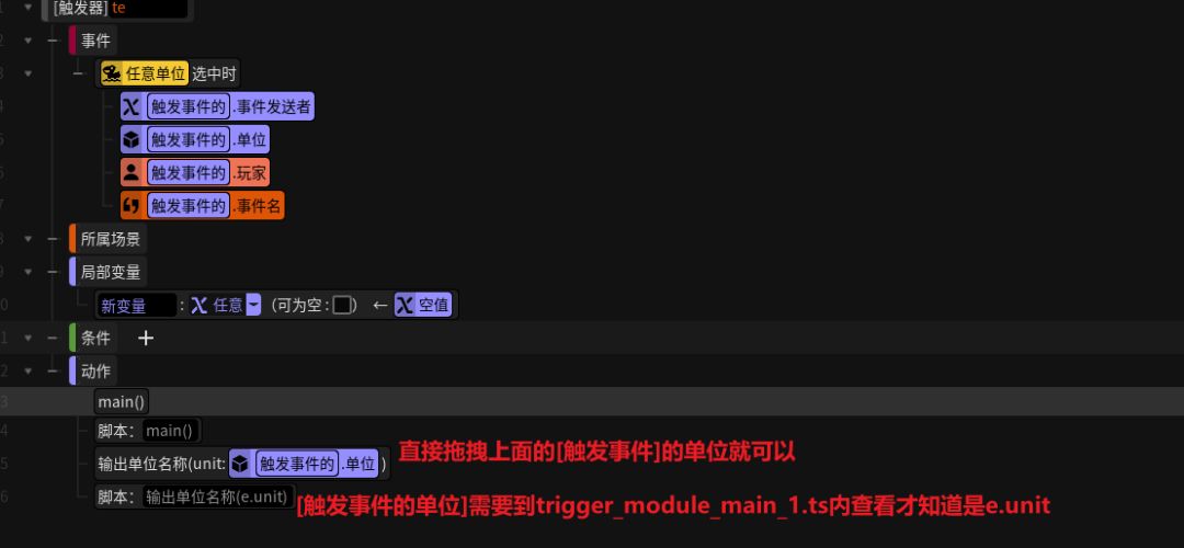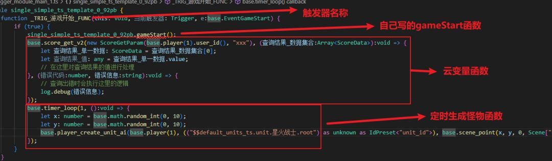 缺点:在写一些需要参数的函数时,可能不知道参数的名称叫啥,需要到trigger_module_main_1.ts查看变量名称。而自定义函数则可以直接拖拽上面的变量来填空。