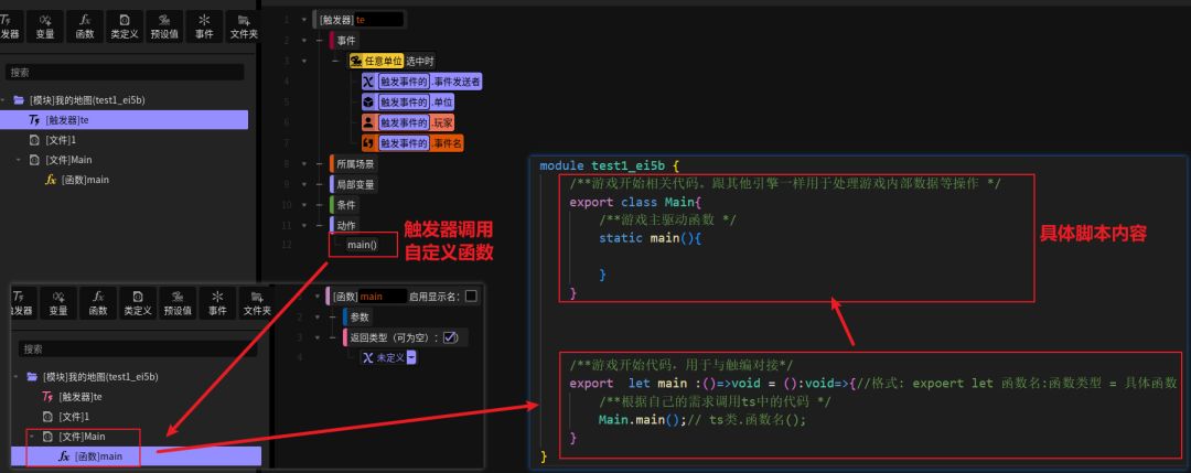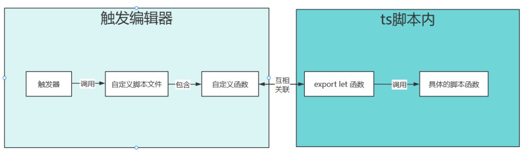 - 其中,[自定义函数]和[export let 函数]作为[触发编辑器]与[ts脚本]互相关联的接口