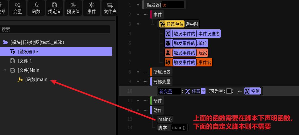 3.2.星火脚本格式:星火的脚本需要声明在【当前项目名的同名模块】下,详见【项目根路径\script\trigger_module_main_1.ts】这个文件。