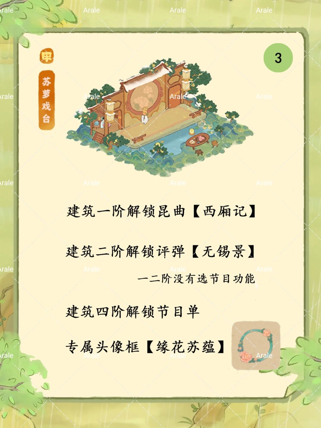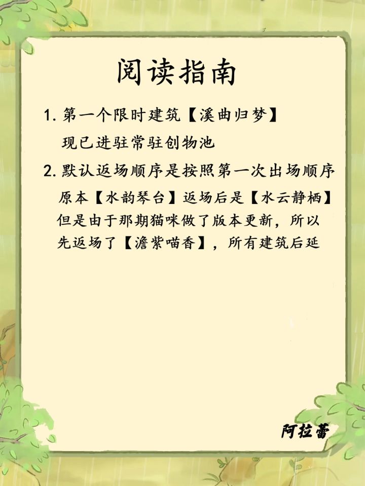 2.默认返场顺序是按照第一次出场顺序,原本【水韵琴台】返场后是【水云静栖】,但是由于那期猫咪做了版本更新,所以先返场了【澹紫喵香】,所有建筑后延。