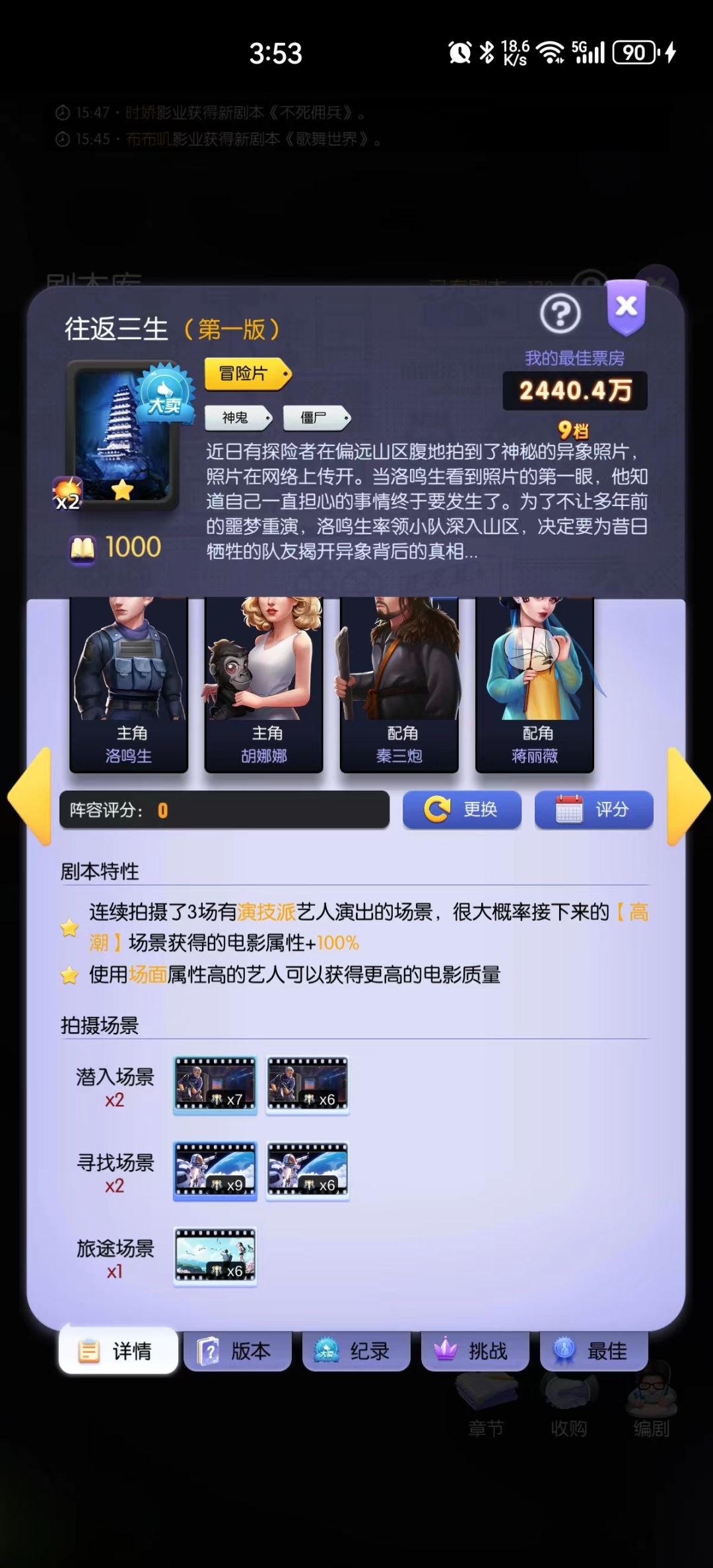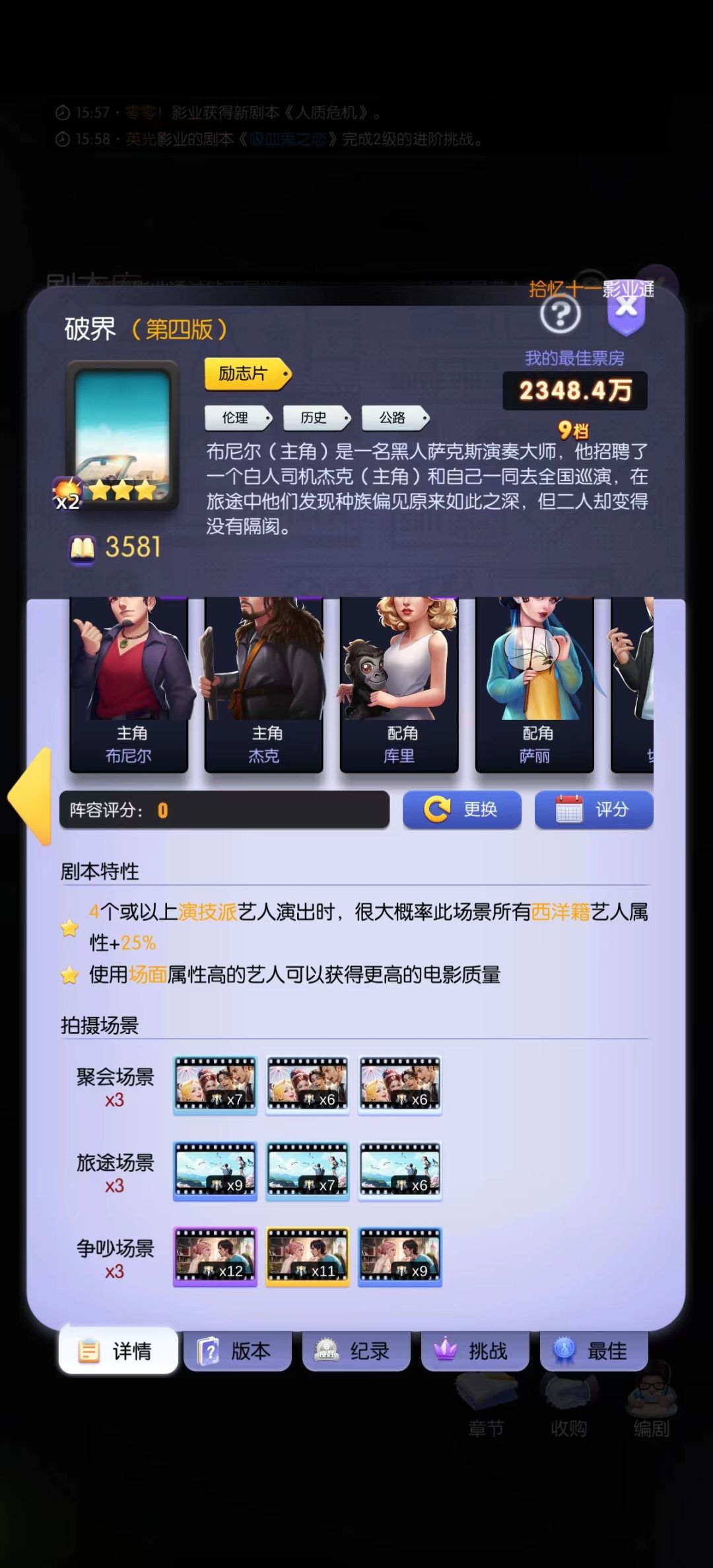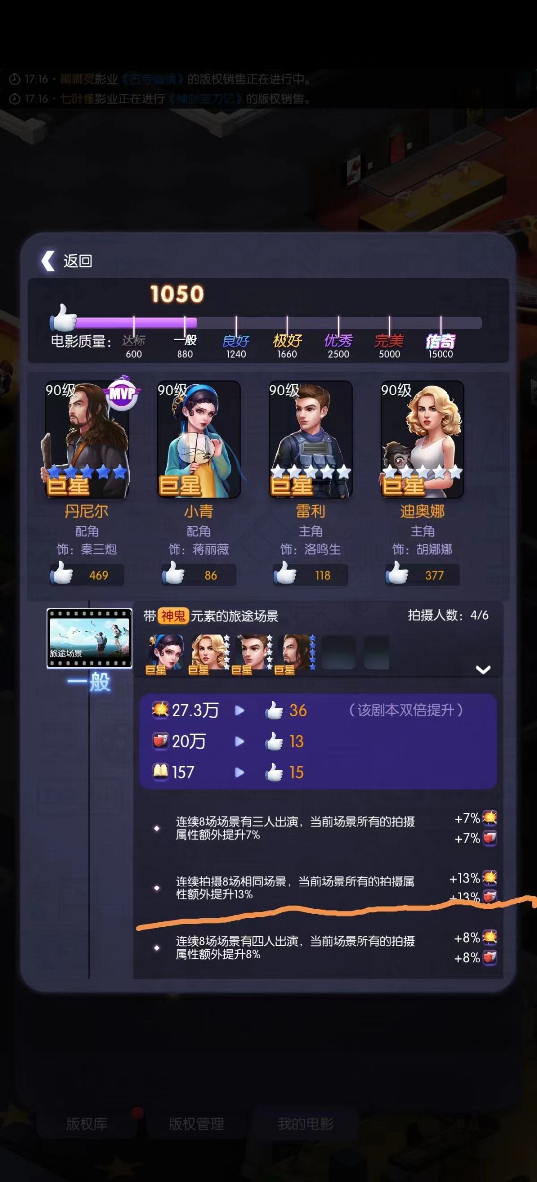 我上次60天帖子写了关于剧本改编所带来的拍摄分数提升,即场景拍摄时场景个数越多,分数越高(类似10集电视剧比5集电视剧能打),剧组演员越多(单个场景出场上限和技能产生化学反应的可能性),分数越高。