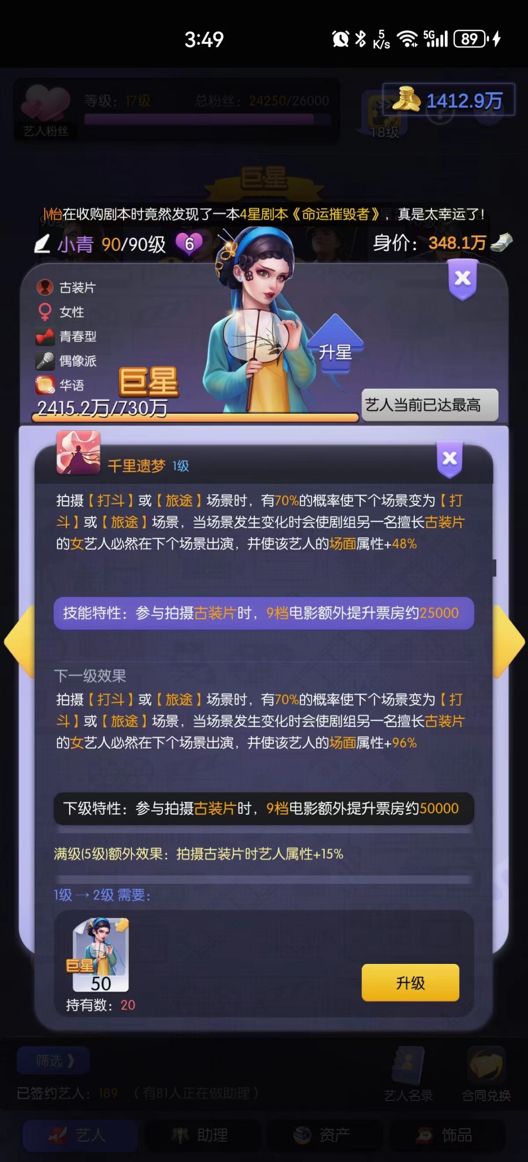 3星完全改剧本 10场景+8演员,单看场景10/8=1.25,约等于增加25%。改剧本耗费资源时间和手,为了达到增加场景的目的还有一种办法就是无中生有,通过演员的技能(小李子的二技能“拥抱风浪”)来凭空创造增加场景。