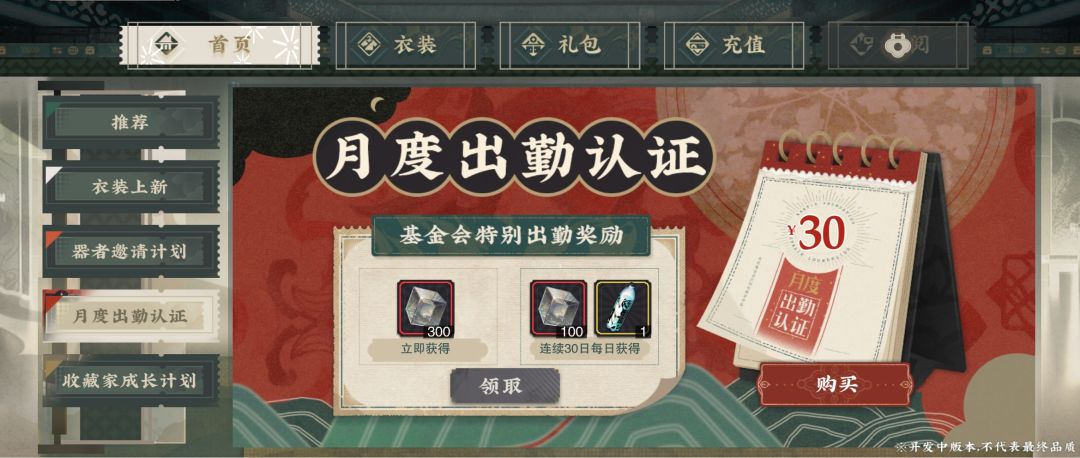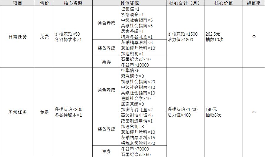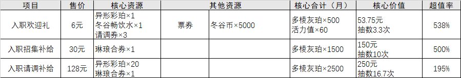 几乎所有手游里,玩家最喜闻乐见的就是月卡,30元30天一共可获得3300个灰珀,相当于22抽。此外还有30瓶冬谷畅饮水,1800活力值折合为1125个灰珀,这样一共4425个灰珀,相当于442.5元,对比售价超值率达到1475%。