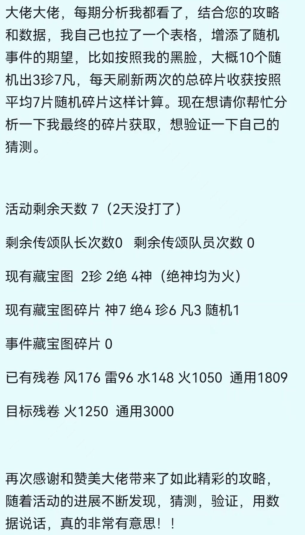 当然,向这样的大佬并不需要我给出啥策略,因为人家会选择无脑拉满:每天刷新十次商店并买空所有商品(随机碎片则留下全用来合成藏宝图)!而我的任务,则是通过前几天的数据,预测出最后可以兑换的图卷数量~![[表情_微笑]](https://img.tapimg.com/market/images/0f170d4b1ecf80c267e5a44b5992a199.png)