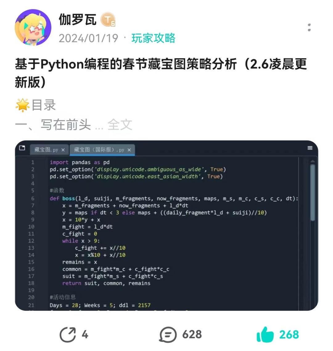 有玩家评论,希望我能将程序分享出来,关于这件事我仍在考虑当中:一是因为自己辛苦写的程序不是很想就这样被所有人白嫖;二是程序是否有bug我还未进行充分地检验,不敢冒然公开;三是因为程序的功能尚未齐全,仅限于计算保底数量(与他人的Excel相比没有本质优势),还有很多有趣的想法尚未得到具体的代码实现。