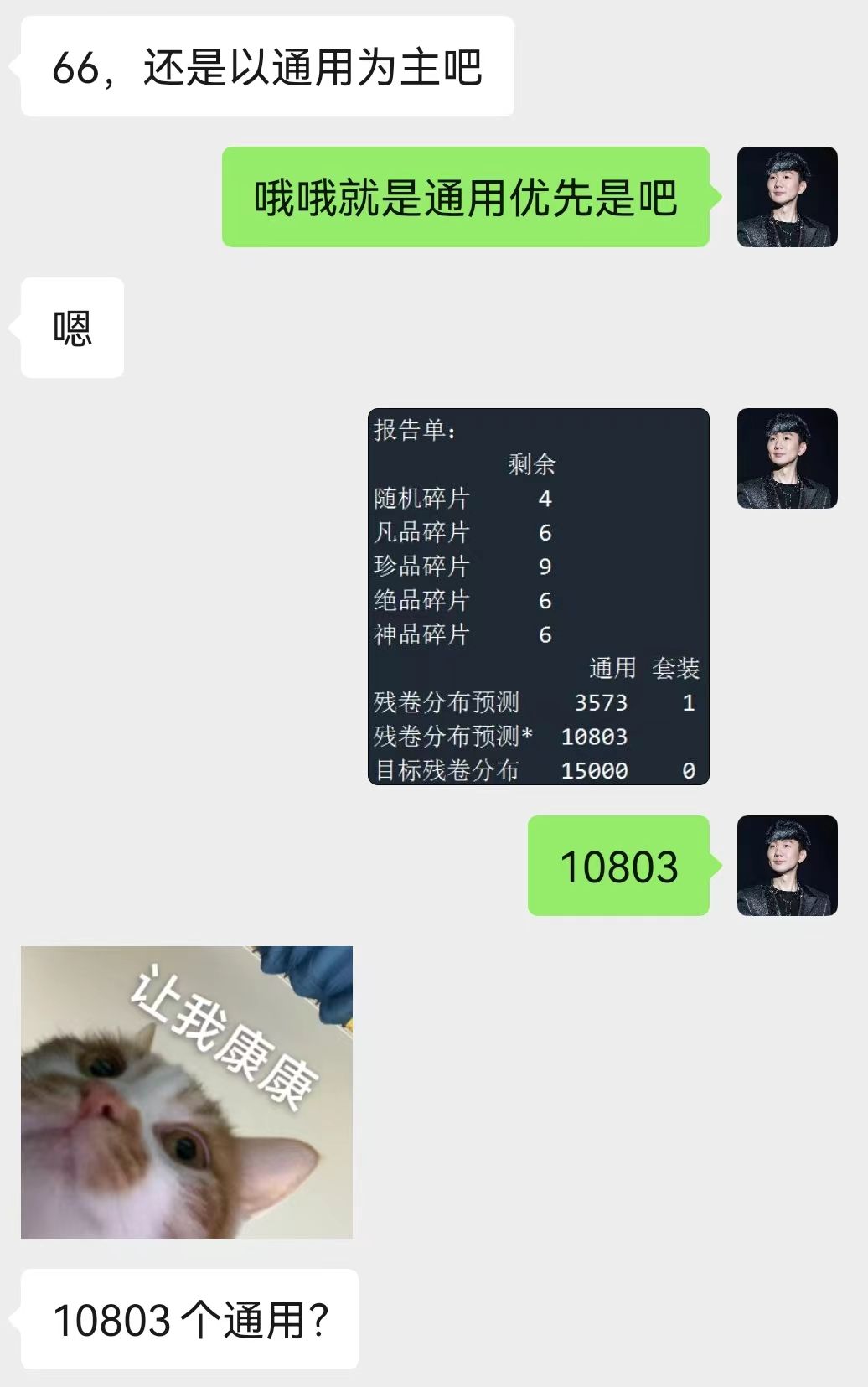 ,增长率为14.54通用/天,总之拿下1500+1250通用是十分稳当的;值得一提的是,虽然我一再强调随机碎片换高品质碎片很亏,该玩家还是用10随机兑换了1片神品碎片,直接增加了48保底,做法相当得机智!