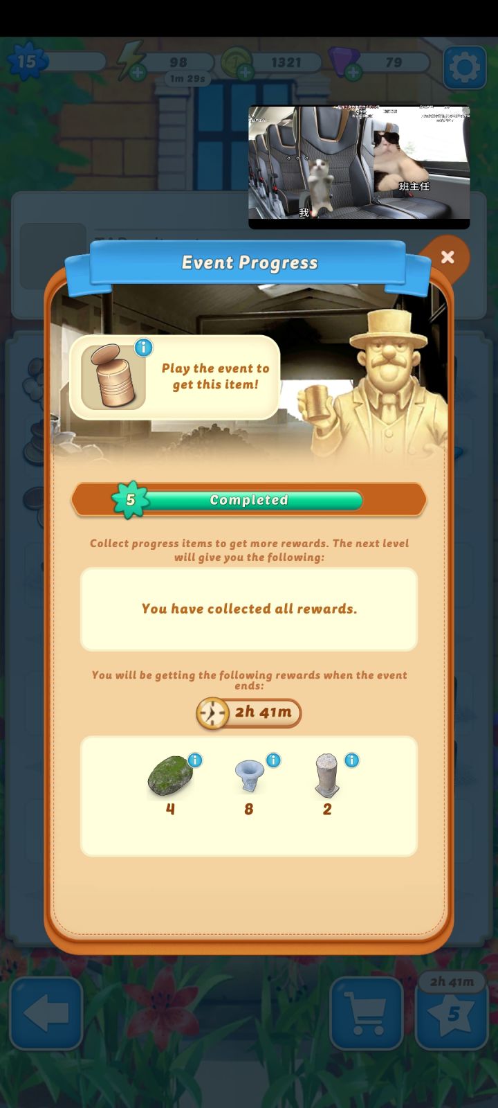 游戏目标:如图我们需要拿到最后的罐头,打活动积攒绿色星星,升到满级就可以停了,否则会消耗过多体力。升级得星星的那个建筑可以看看家族发家史,除此之外几乎没有什么收益,而且我用了好几管体力和十分钟无限体力都刷不到最后,得不偿失。