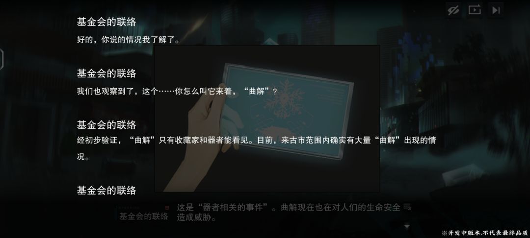 玩家准备送不知道怎么到来古市的蝠桃瓶回上海,某天晚上突然怪物来袭,基金会对此毫无准备,临时听玩家一席话将其命名为“曲解”。玩家报告完毕带上花瓶救人。“曲解”好猛,全程旁观玩家还被余波干的恶心,市民死了好多,但他们互相帮助好感动啊,我们也要出一份力(感动,感动)。蝠桃瓶感觉人死的差不多了,受不了了,回顾了器生,决定来一场殊死一搏(到现在也没明白拿什么去搏,建议此处加一张蝠桃瓶放技能打怪的插画)。玩家脑海中闪过一个画面,觉得蝠桃瓶似曾相识,于是拉住蝠桃瓶嘴炮一波。嘴炮结束,蝠桃瓶不用死了,曲解莫名其妙就死了。