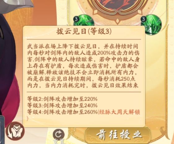 武当派此角色绝技是他最大的优势,是所有角色里独一无二的存在,技能介绍大家自己慢慢看,看完我来分析细节,对剑阵内的敌人造成200%攻击力的伤害,大家注意剑阵内这词,如果敌方都在剑阵里,那武当可以攻击所有角色,如果在剑阵之外,武当是打不到对面的,所以武当玩起来效果变化无穷,看对面的阵容和自己阵容的搭配。