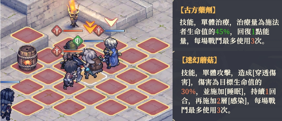 古方药剂&迷幻蘑菇为3格射程、单体目标。
