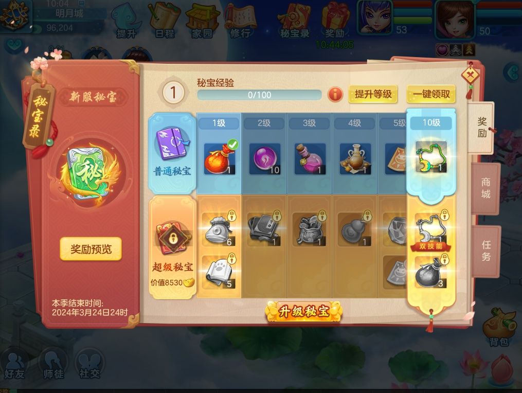 1)限3月1日新服“春风得意”开启新服专属秘宝录,完成秘宝任务即可领取丰厚大礼,还可以升级超级秘宝领取更多超值奖励!