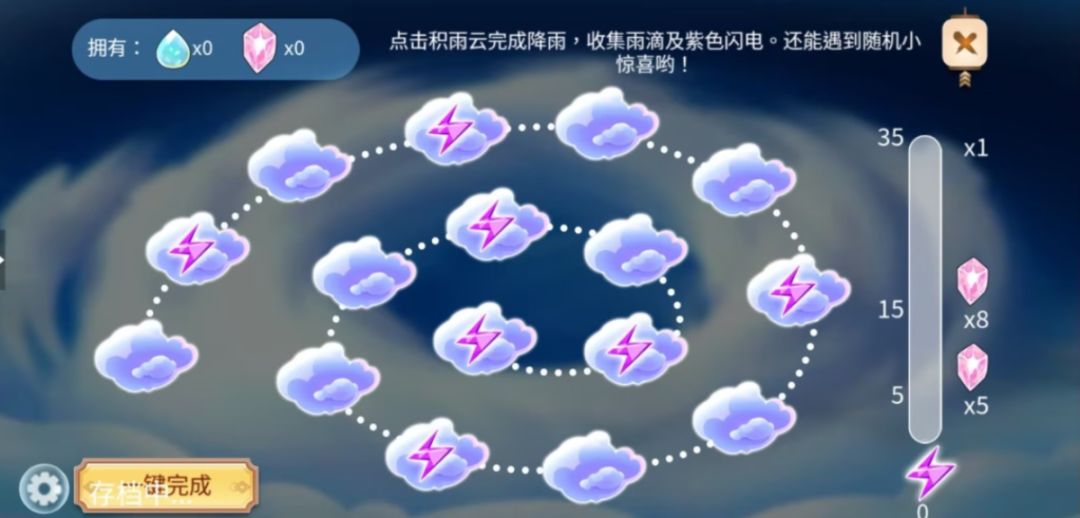 点击积雨云完成降雨,收集雨滴和紫色闪电,紫色闪电数量累计进度可以额外获得粉色晶石和惊喜奖励。