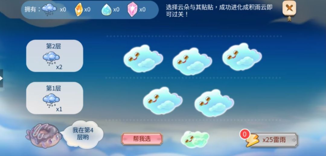 消耗云朵并选择一个大云朵进行贴贴,点击收集闪电,成功将大云朵进化成积雨云即可过关。累计足够的闪电可以解锁春雷任务。