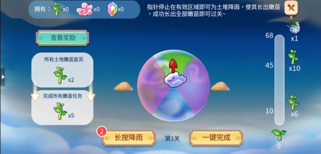 长按降雨按钮让指针停止在粉色区域内即可触发降雨,让对应的小土堆长出嫩苗,成功长出全部嫩苗即可过关。累计嫩苗可累计进度获得更多奖励。