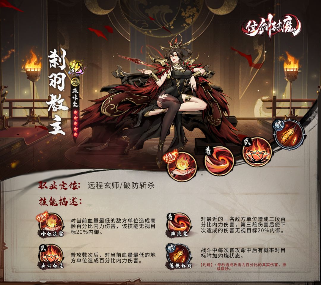 生平:刹羽教本名为惜羽府,是为先帝年间宫中教坊,与宸王交往甚密。齐国先帝晚年沉溺教坊舞乐,朝代更迭后,史官皆认定惜羽府之繁盛间接引起夺门之变,因而武帝登基后,便下令遣散惜羽府。