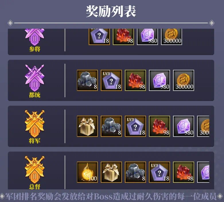 后期每日攻打世界Boss据点拿奖励。资源丰富,这是军团的最大福利。参与玩家每日40石头,活动最少都能拿到600石头。