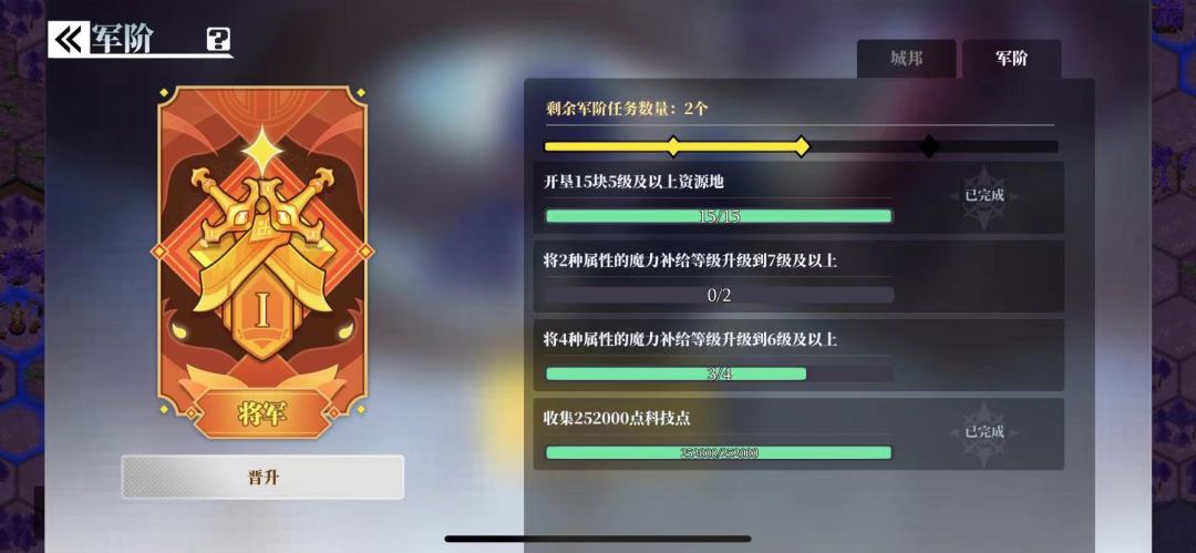 军衔门槛:都统升将军需要开垦8个5级土地,占领一个6级土地,3种属性的魔力补给升级到6级,收集150000科技点。