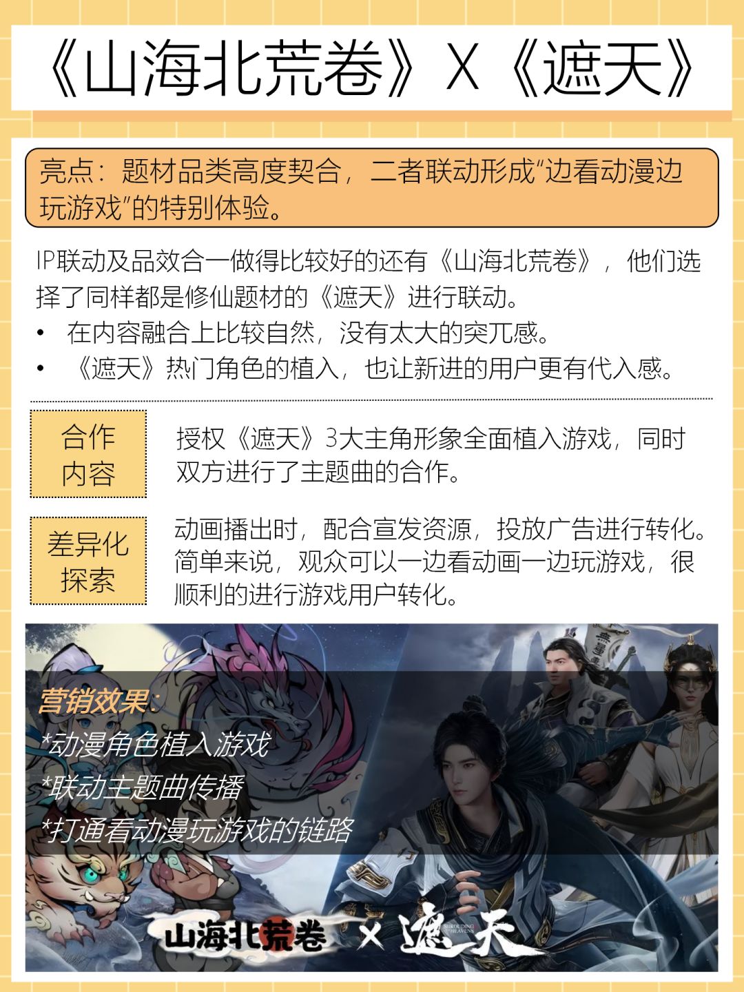 合作内容:授权《遮天》3大主角形象全面植入游戏,同时双方进行了主题曲的合作。