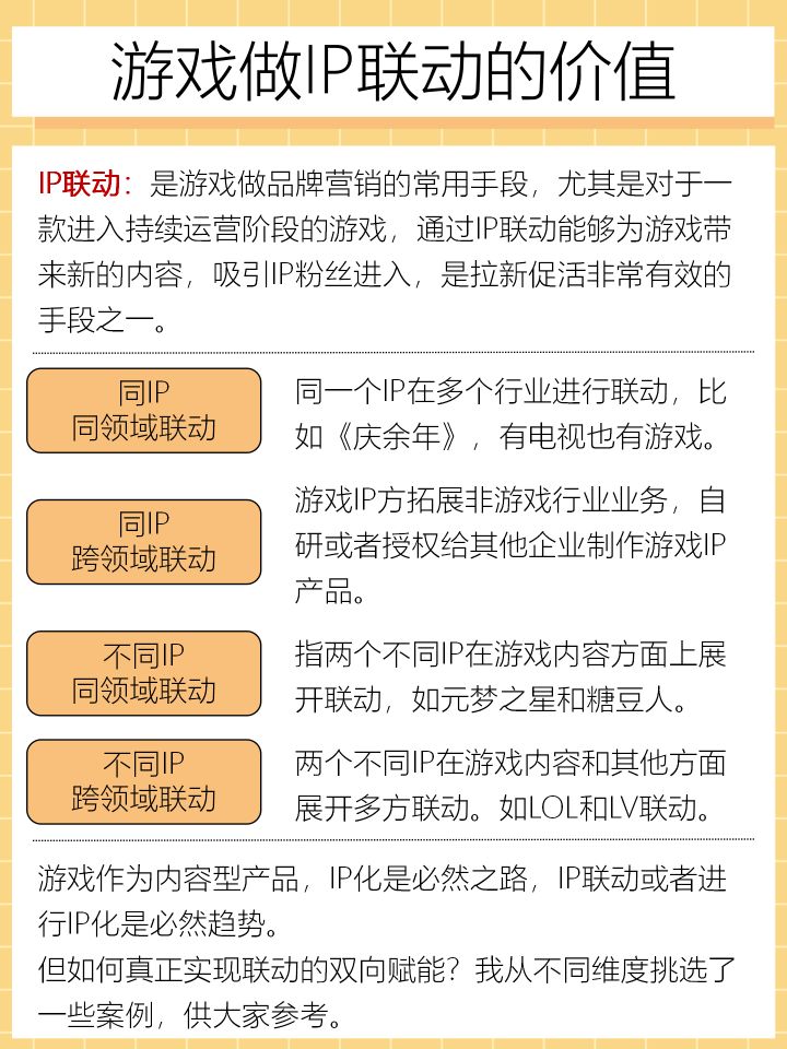 IP联动是游戏做品牌营销的常用手段,尤其是对于一款进入持续运营阶段的游戏,通过IP联动能够为游戏带来新的内容,吸引IP粉丝进入,是拉新促活非常有效的手段之一。