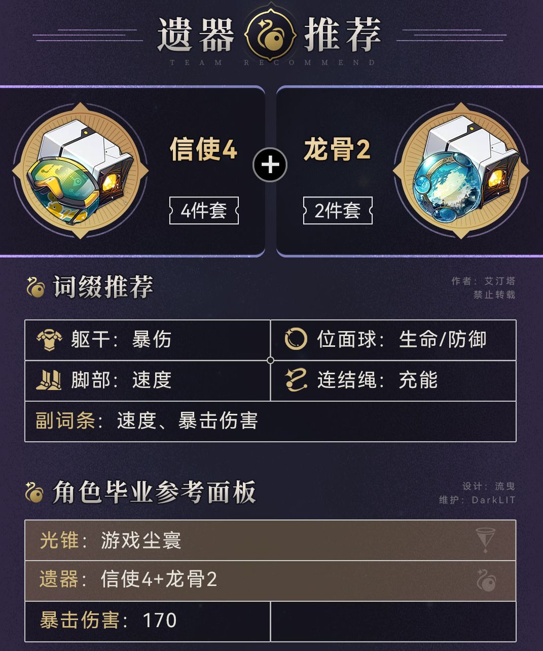遗器部分,花火的战技收益和本身暴伤挂钩,作为一个辅助,自然外圈选择信使套,内圈选择龙骨。信使套能再开大后给队友加速,龙骨提供暴伤能加成花火战技。