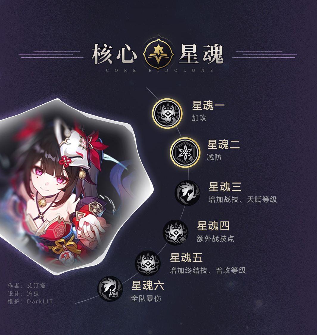 花火的星魂比较收敛,收益最高的是一魂和二魂。一魂提供了40%攻击力,实际上这个数字是非常高的,要知道罗刹一魂才20%。二魂相当于提供了24%减防,配队中有其他减防或者无视防御收益会更高,要不然提升数值不大。