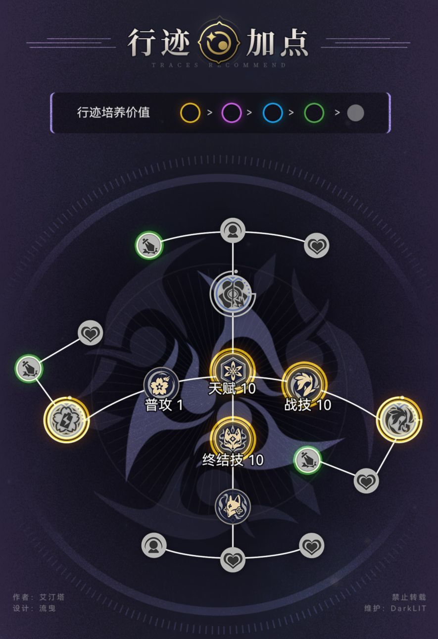 行迹加点方面,花火的行迹要优先是战技,额外能力点优先点左右两侧,最后一个额外能力就15%的攻击力,如果不是量子队是完全可以不点的。天赋和终结技的功能性和等级无关,如果是看重数值这俩从1级到都是10级,也就只是从27%增伤提升到48%增伤,成长幅度堪忧。所以说适当点点天赋和终结技的等级就行了,留到最后再升10级。