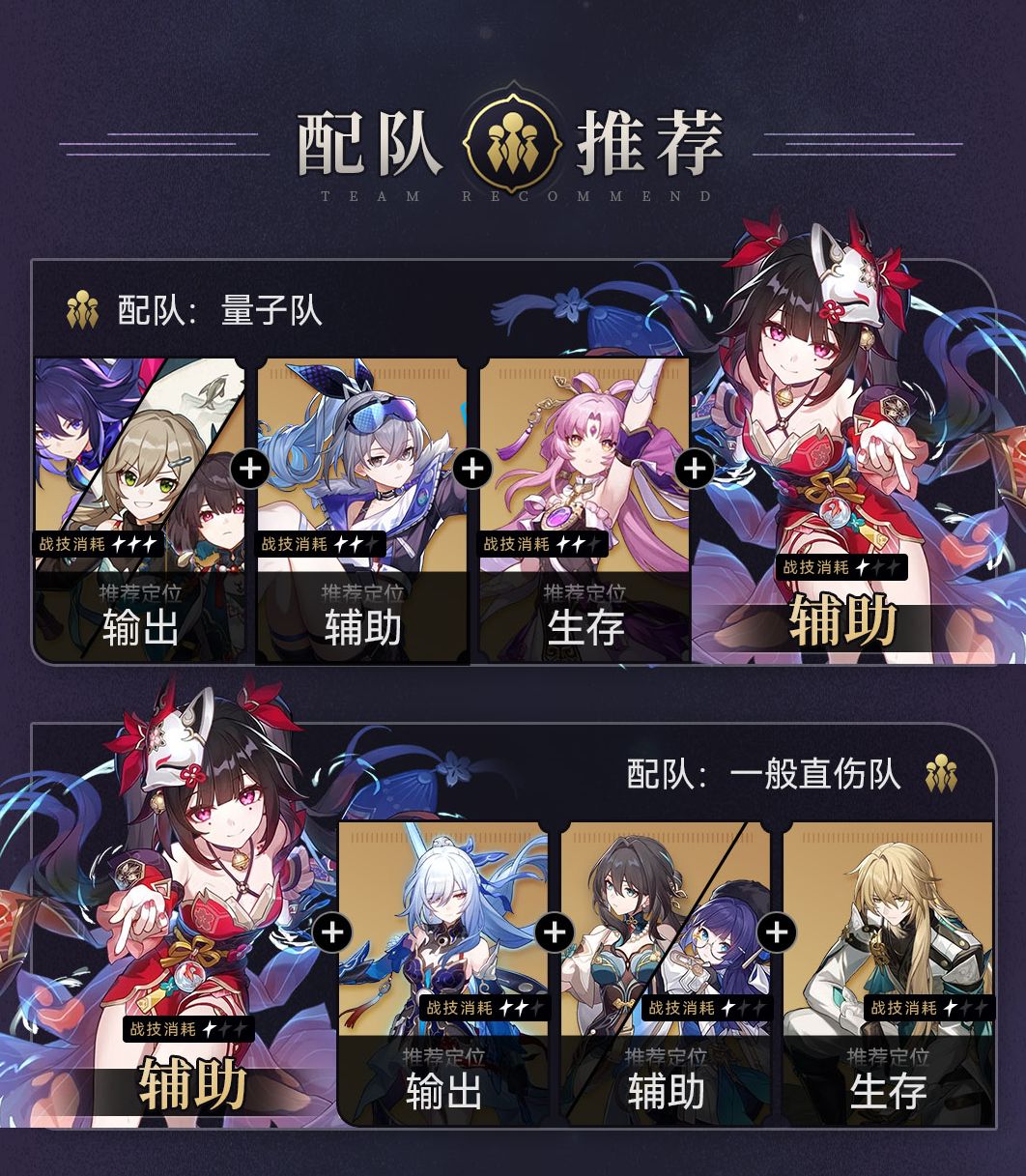 不玩量子队,花火也有出路。花火和鸭不同,花火的战技是能加成到回合外追加攻击的。花火只和鸭这个辅助不兼容,传统的直伤队随便搭配另一个辅助和直伤C一起输出就行了。例如景元、镜流。