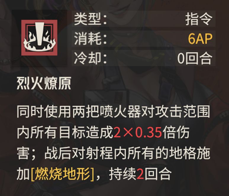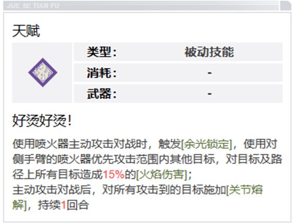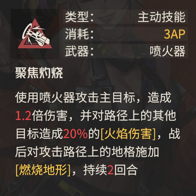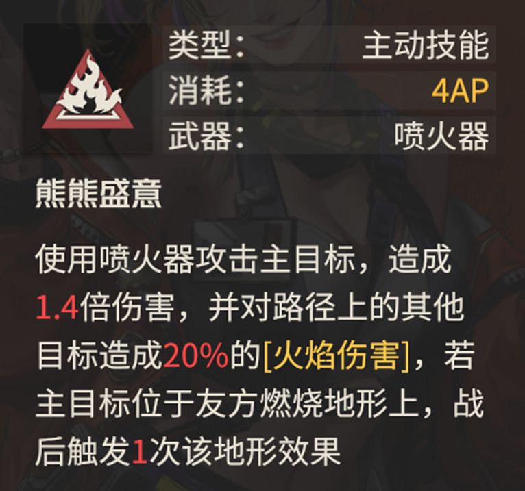 这个技能中有对路径上的其他目标造成20%火焰伤害的描述,但实际上这是喷火器自带的效果,也就是说这个技能效果只有两个,1.4倍的主目标伤害以及对主目标触发一次燃烧地形的效果