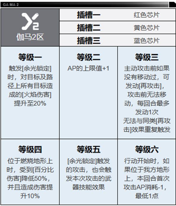 等级六:这个效果也不错,首次攻击减少1ap,缓解了绘梨沙技能的ap消耗的问题,其条件没有限定燃烧地形,对于将来的其他地形的兼容性也比较好