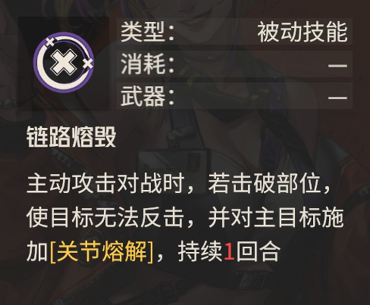 [关节溶解]:主动攻击或使用指令后,所有部位损失最大耐久值5%的伤害的固定伤害。类似于短路效果,需要有具体行动,如果直接待机则无法生效。同时伤害量更小