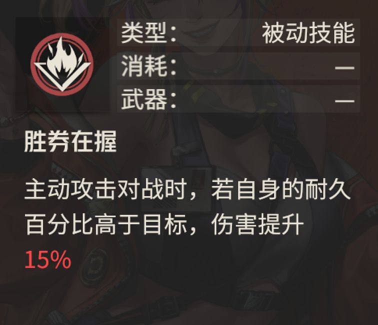 这个技能是一个中规中矩的增伤技能,限制条件为自身耐久值百分比高于目标时,这也就意味着携带此技能时不适合担当先手攻击的机师,应在队友攻击压低敌人血线后,绘梨沙再出手