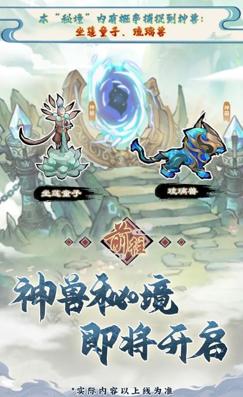 神州大陆神兽秘境再度开启,掌门前往该“秘境”内搜寻灵宠将有概率捕捉到神兽:琉璃兽、坐莲童子。