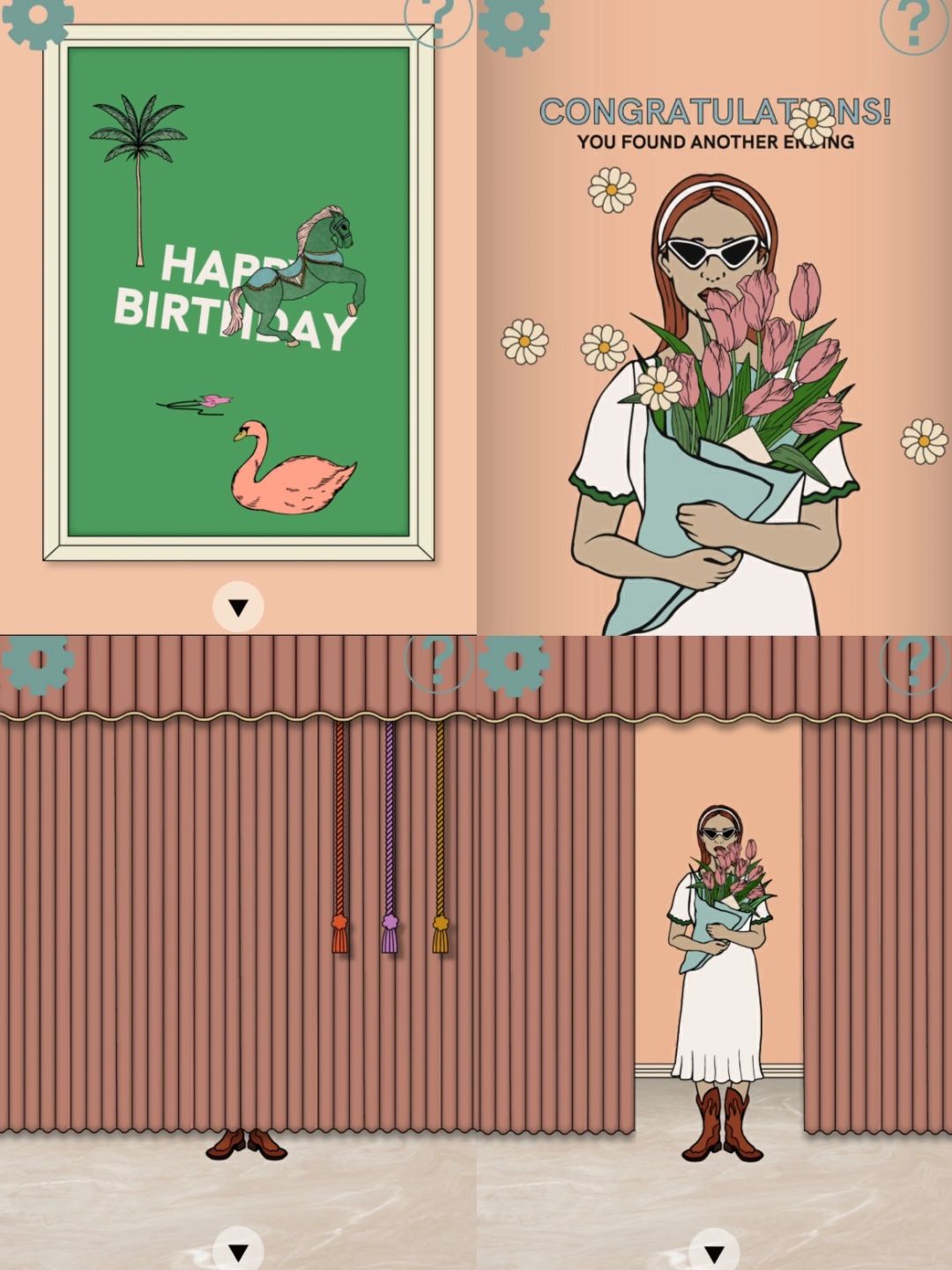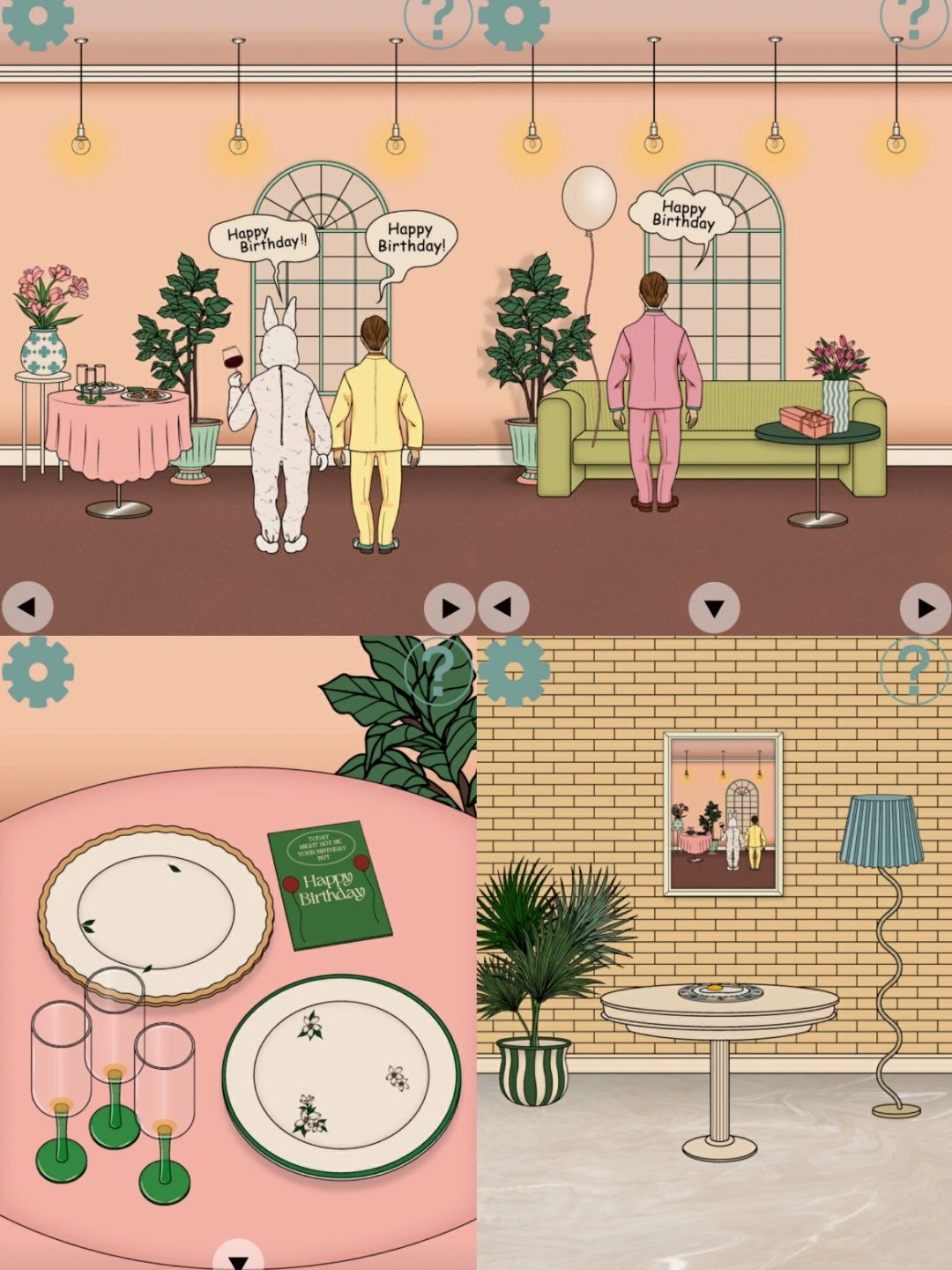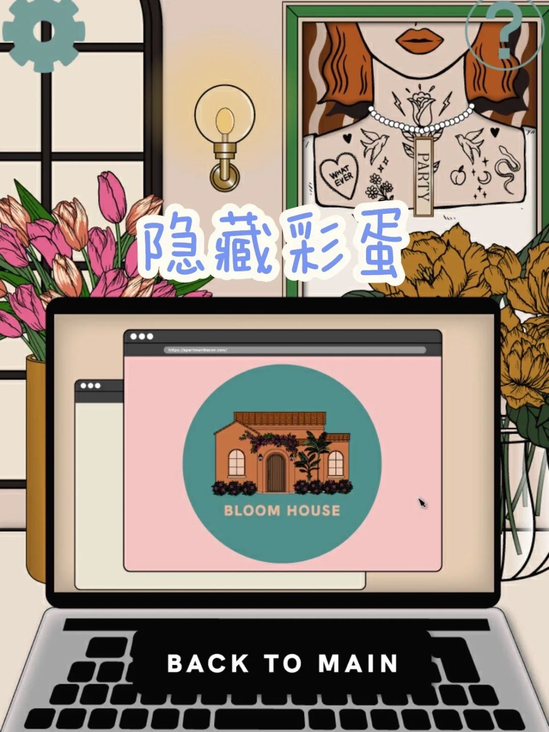 还有隐藏彩蛋~通关后再次进入密室,将玩偶放在红白竖条的格子里,再出来后电脑屏幕出现了相框,点击少女前方的牌子获得party电梯按键,再将玩偶放入左下角粉色白点格子中,进入电梯换上牌子,来到party层~惊喜才刚刚开始~