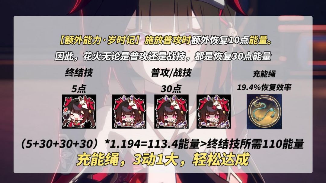 花火带充能绳可以轻松3动1大:(5+30+30+30)*1.194=113.43能量>终结技所需110能量。
